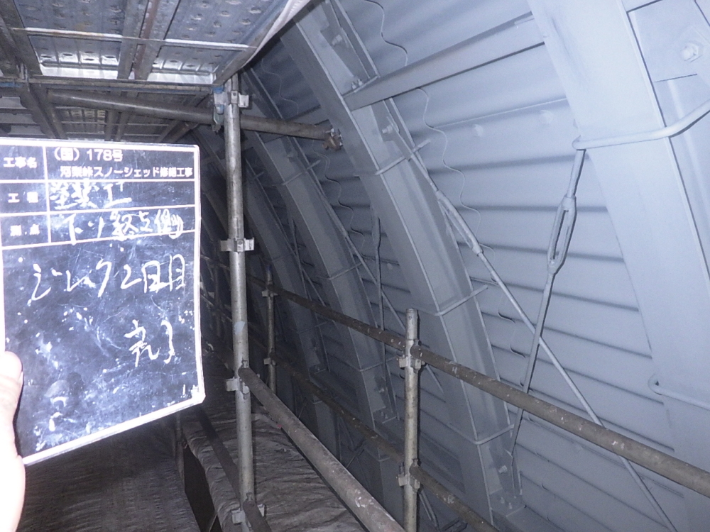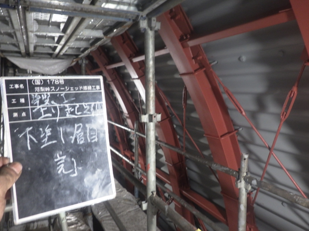 施工事例Works (国)178号 河梨峠スノーシェッド修繕工事 Category All 40 土木工事11 鋼塗装工事(土木工事)4 砂防えん堤工事(土木工事)4 法面工事(土木工事)3 建物補修・耐震3 造園・ガーデニング0 森の小舗(景観舗装)0 エコチップ(景観舗装)1 エコロード(景観舗装)0 遮熱エコシールドK(eco塗装)3 遮熱エコシールドG(eco塗装)11 光触媒GP-Fシステム(eco塗装)0 光触媒K2コート(eco塗装)0 室内用光触媒K2コートV(eco塗装)0 不燃塗装(eco塗装)0 防汚・防腐塗装(eco塗装)0 液体ガラス(eco塗装)11 2026年2月に竣工しました (国)178号河梨峠スノーシェッド修繕工事です。 工事期間中、地域関係者の方々及び通行者の方にはご理解とご協力をいただき無事故無災害で竣工できました。 ありがとうございます。 この事例での事業内容 鋼塗装工事 着手前 足場組立 塗膜剥離・ケレン 塗膜剥離・ケレン完了 ジンクリッチペイント(防食塗装) 下塗1層目 下塗2層目 中塗 上塗 完成